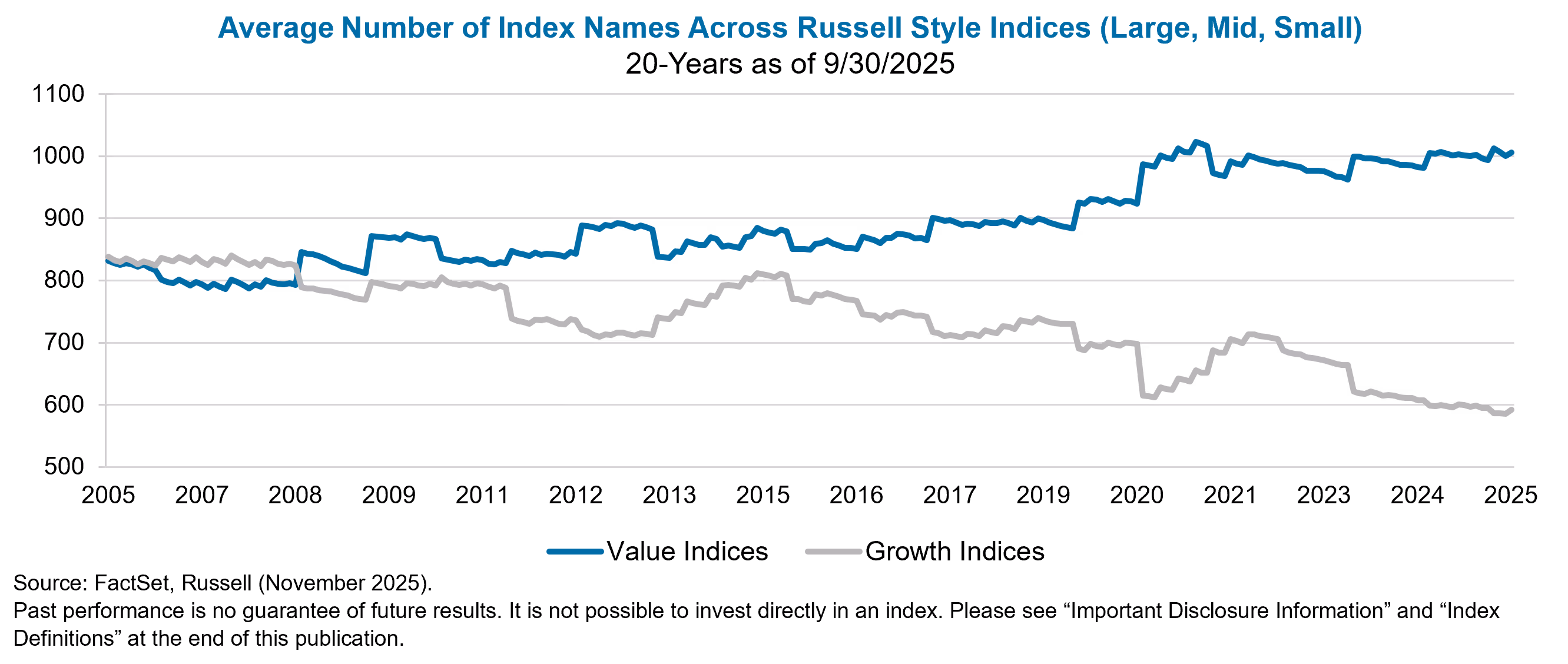 Although the increased concentration is often viewed as a large-cap phenomenon, the data below further shows that both small- and mid-cap growth indices have also seen a significant decline in the number of constituents, along with a rising share of weight in their top 10 holdings. In aggregate, it has had the opposite impact on the value side of the coin.