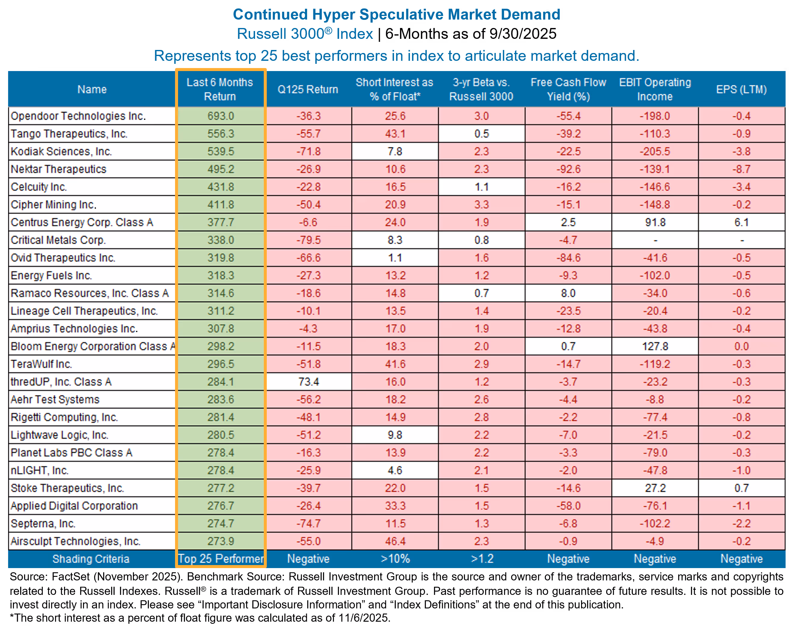 Similar to past market tops or bubbles, investors tend to be captivated by themes and certain types of securities that appear “exciting” at the time, often with little regard for valuations or fundamentals. This has certainly been the case in the current market environment as we sit in the 16th year of a growth cycle with various indices at all-time highs. This speculative backdrop was not present throughout most of the growth cycle, but has become severely pronounced over the past few years where the market has rewarded expensive momentum stocks of lower quality in general, while punishing cheaper cohorts of stocks. This backdrop has undeniably been even more exacerbated over the past two quarters. As depicted on the next page for the Russell 3000® Index (as a proxy for the broad market), what is moving the market are securities with truly speculative characteristics as defined by the cross section of negative earnings, negative operating income, negative free cash flow, and those identified as highly shorted and very high beta (and expensive!). This is a phenomenon present across market capitalization and style, despite the market narrative on lack of breadth in the market favoring only the “Magnificent 7”.